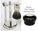 SimplyBeautiful Shaving Gift Set with Merkur Razor, Chrome Badger Brush, Chrome Stand, and Omega Shave Soap in Bowl - Great Christmas Gift
